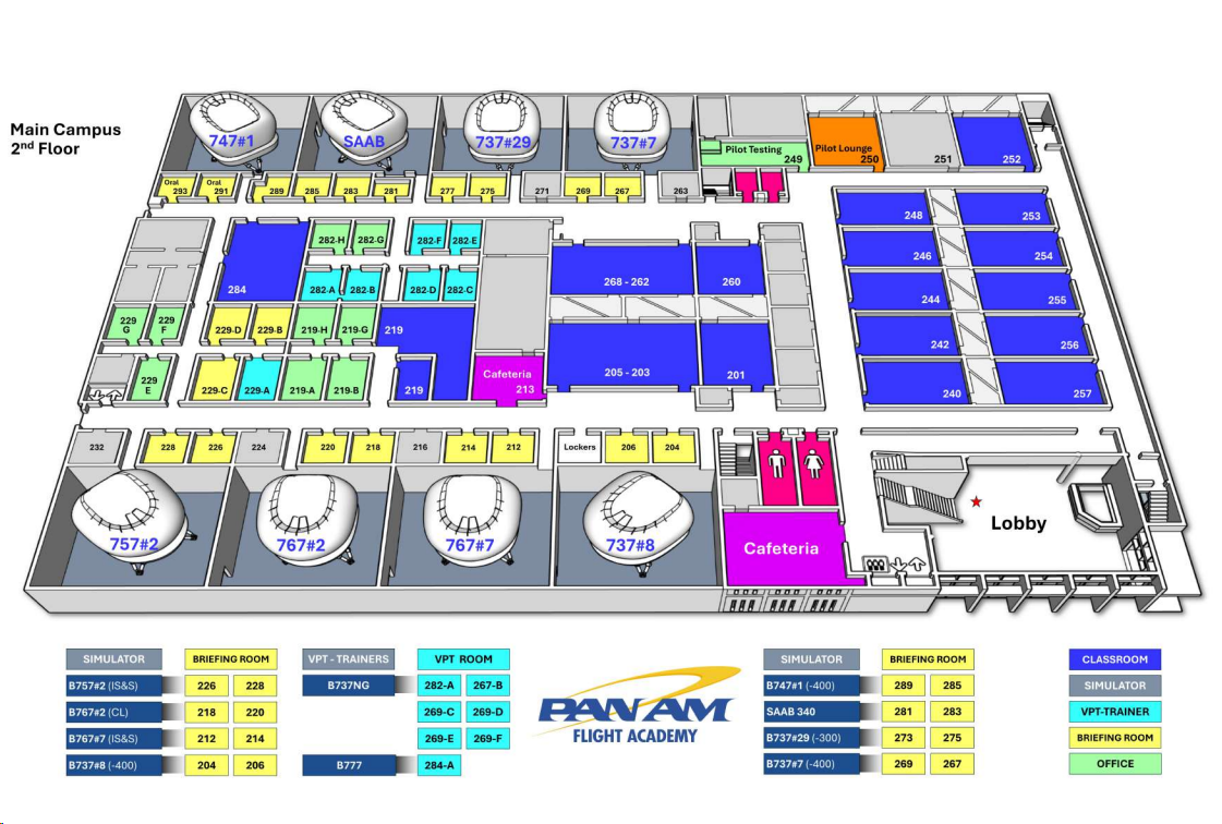 This level allows entrance to our full-flight simulators for the B747-400, B737 (300/400), B757, B767, and SAAB 340. Each simulator bay is strategically positioned near its corresponding briefing rooms and VPT areas, allowing for seamless transitions between ground instruction and simulator sessions.